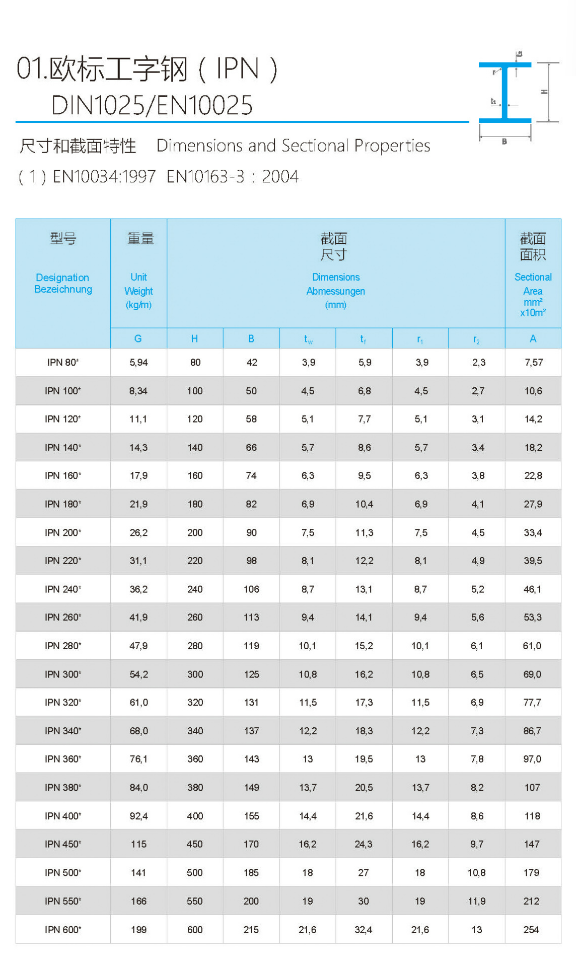 IPN歐標(biāo)工字鋼規(guī)格尺寸重量表